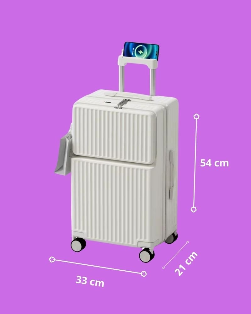 Cuenta con ruedas giratorias 360° que permiten un desplazamiento suave y silencioso, además de manija telescópica resistente para mayor comodidad al transportarla. Su diseño moderno incorpora un soporte para celular en la parte superior, perfecto para ver videos o mantener tu teléfono a la vista mientras esperas en el aeropuerto.